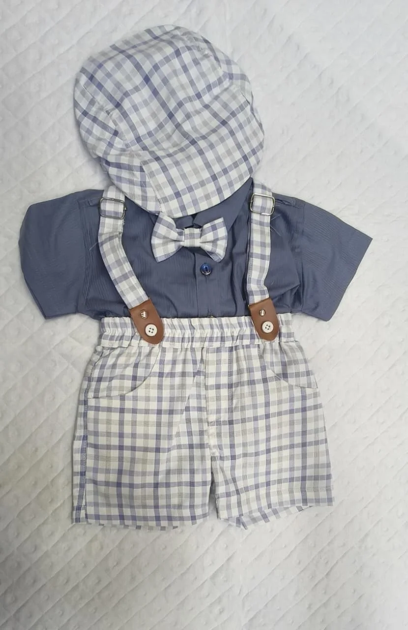 Cute checkered outfit featuring a blue shirt, matching bow tie, suspenders, and cap.