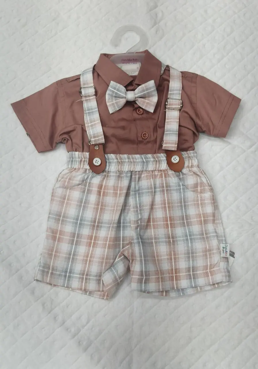 Trendy brown shirt set with matching bow tie and plaid suspender shorts