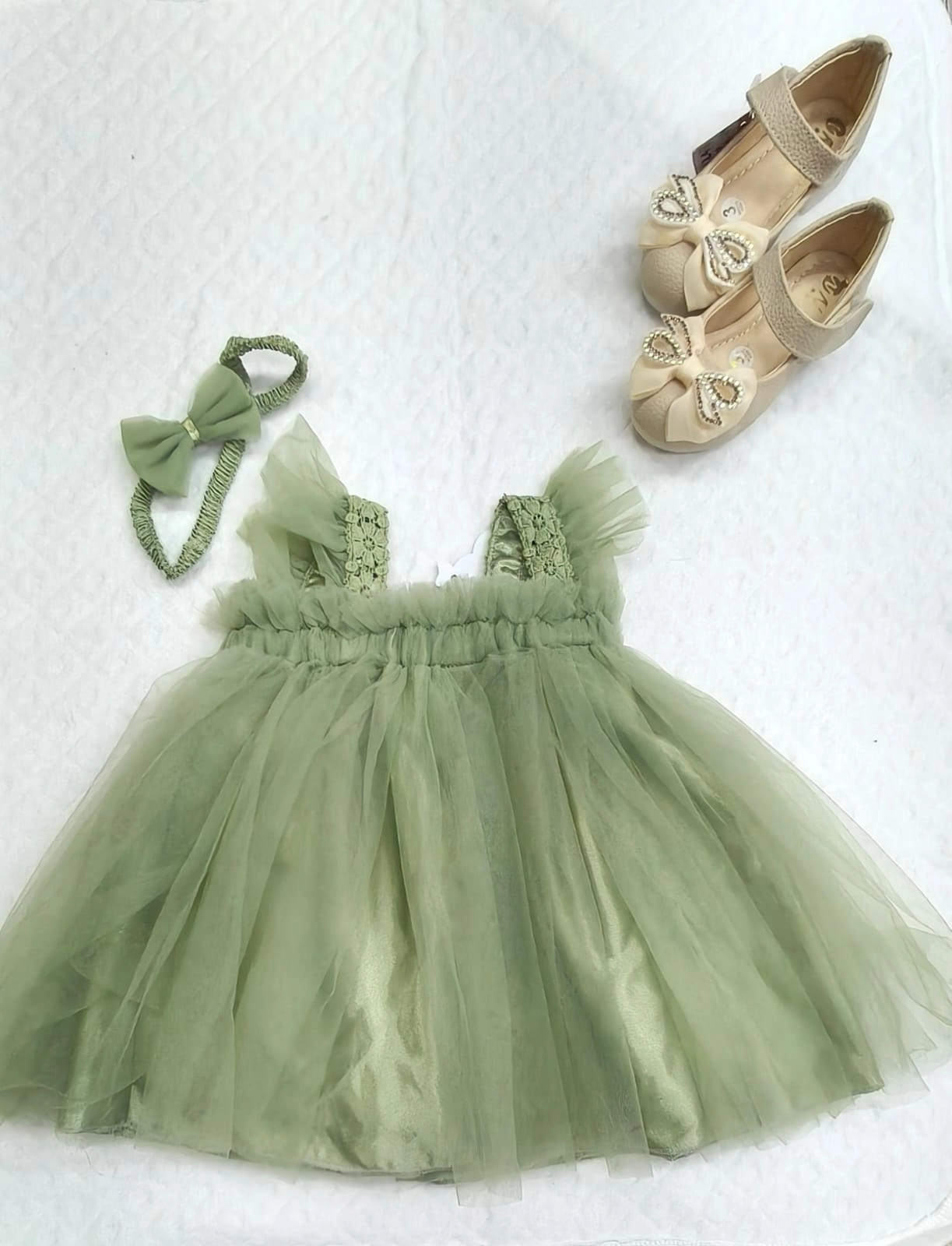 Adorable sage green baby girl dress featuring a soft tulle skirt